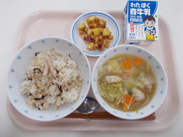 ツナと塩昆布ごはん 白菜と鶏団子汁 大豆とさつま芋のごまみそ和え 牛乳