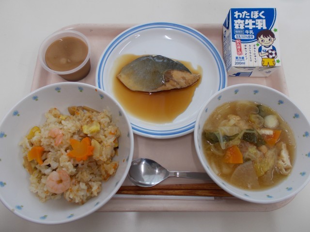 ふきよせごはん 魚の照り焼き みぞれ汁 豆乳黄な粉ゼリー 牛乳