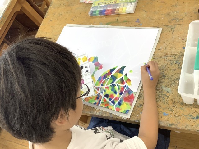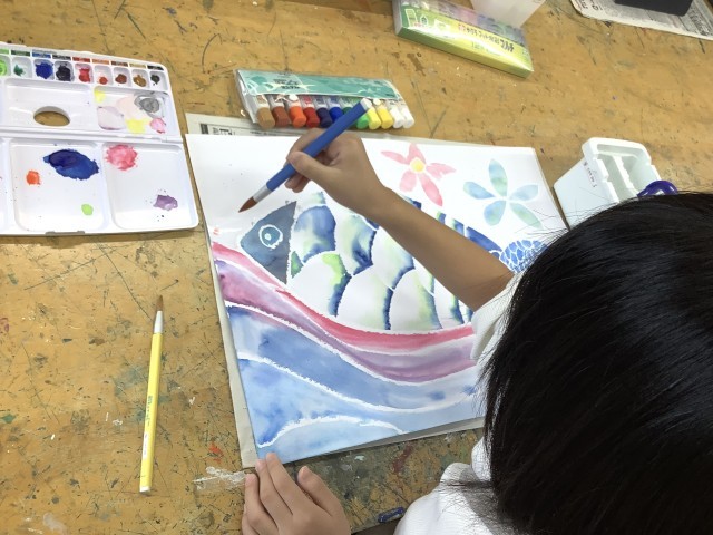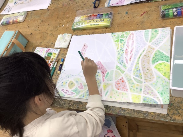3年生は「にじんで広がる世界」の学習に取り組んでいます。水彩絵の具のにじみの表し方に挑戦し、水の量や絵の具のぬり方を工夫して楽しみながら描いていました。