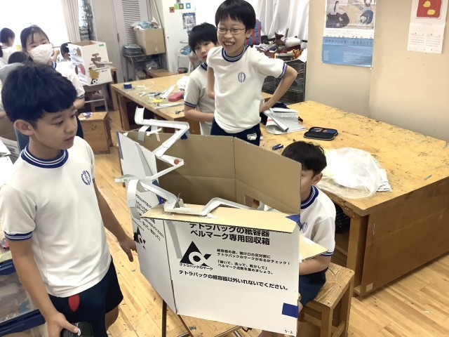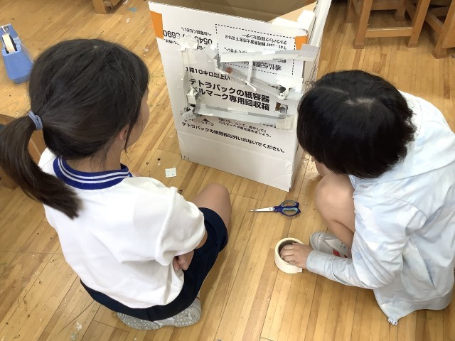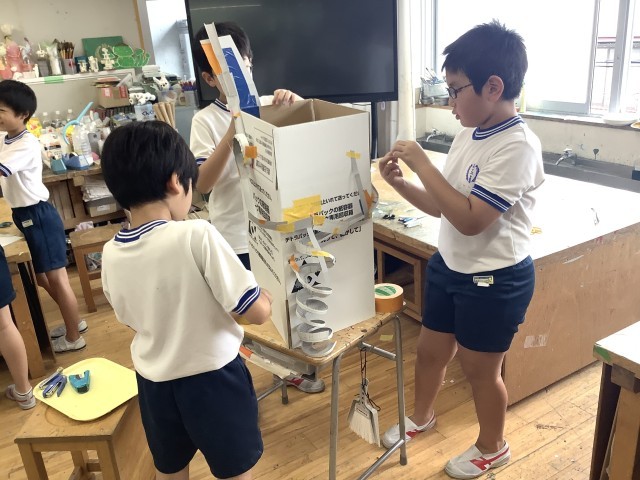 5年生は「ダンボールビー玉コースター」を作っています。ダンボールを上手に利用しながら、工夫してコースを作り、何度もビー玉を転がしてコースを確かめながら改良しながら作っています。