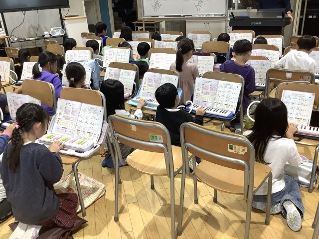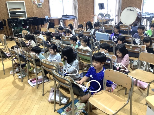 2年生は音楽の授業で「リズムをかさねて楽しもう」の学習をしています。鍵盤の指の位置に気を付けながら「山のポルカ」を演奏していました。