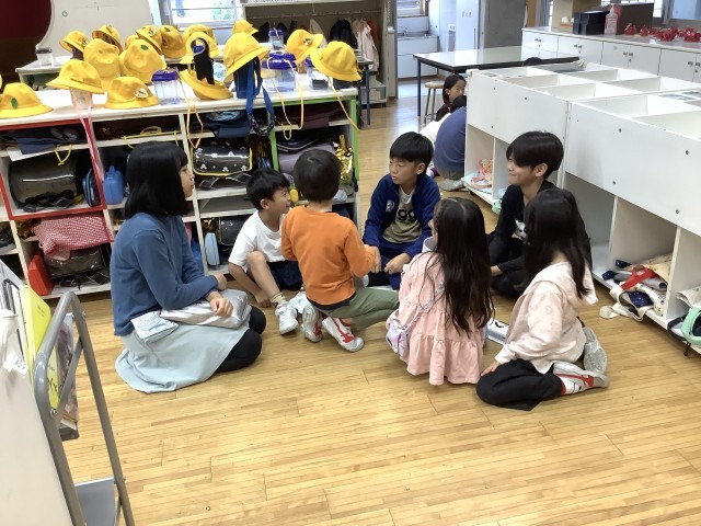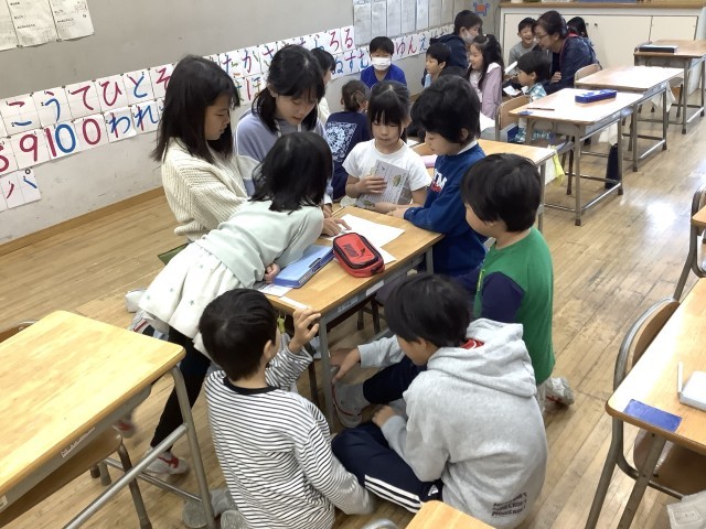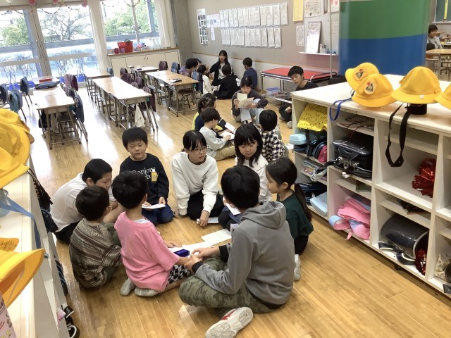 1年生と6年生は、11月に行く遠足の打ち合わせをしました。縦割り班ごとにグループになって、しおりを確認しながら楽しく遊ぶためのめあてなどを決めていました。6年生が1年生に優しく関わっています。