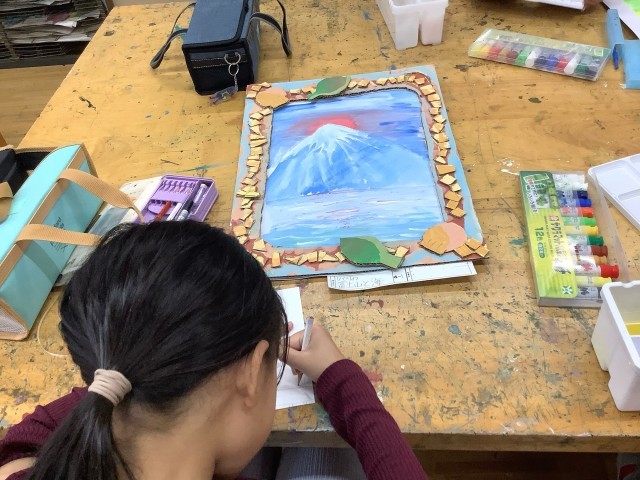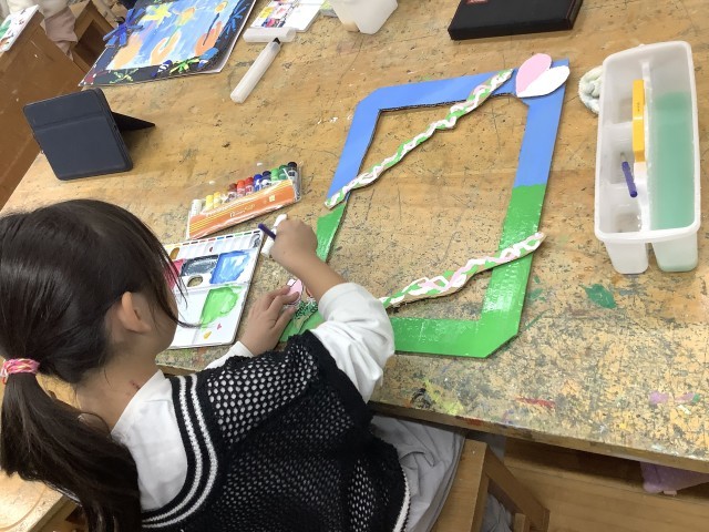 4年生は、図工の学習で「がくぶちから はじまって」に取り組んでいます。額縁を始めにつくって中の絵を仕上げ、額縁と中の絵を貼って名札を付けました。すてきな絵ができました。