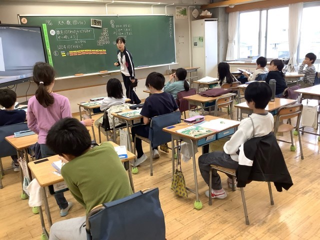 3年生は、算数「大きい数」の学習をしています。10でわったときの商がいくつになるかを、10倍したときと関連付けてきまりを考えることができました。