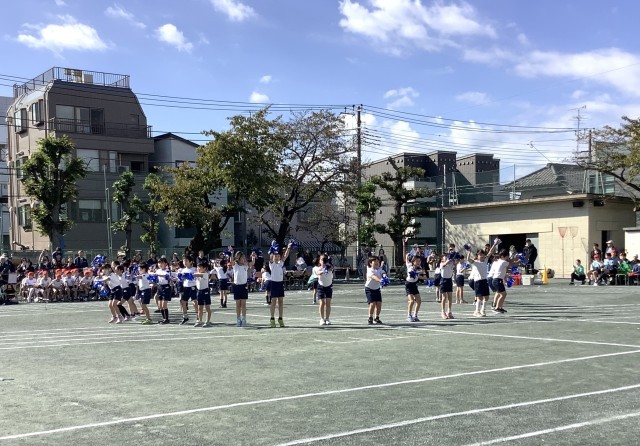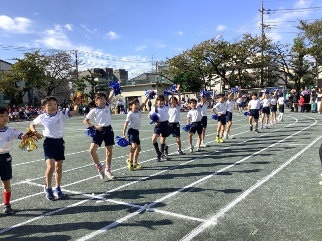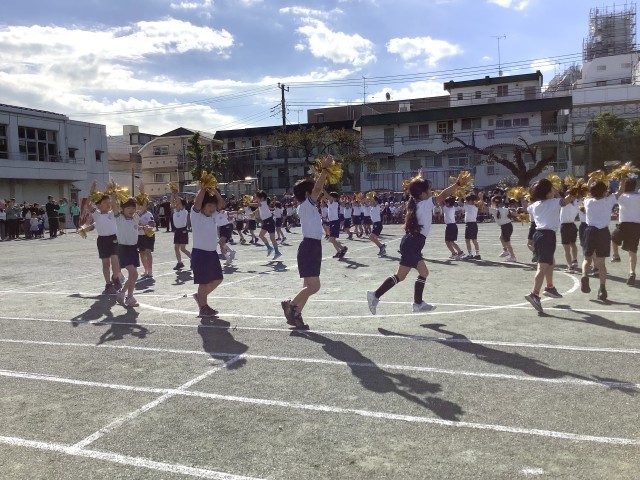 1年生2年生は、表現「たってすわって いっしょにばんざい」を、カラフルなポンポンを持ちながら元気いっぱいに笑顔で踊りました。