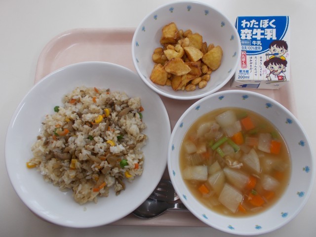11/12(水) 公開日 2025/11/12 更新日 2025/11/12 給食室より ☆献立☆鶏ごぼうピラフ かぶのスープ ビーンズポテト 牛乳☆産地☆鶏肉(岩手)、ごぼう(青森)、にんじん(北海道)、たまねぎ(北海道)、かぶ(青森)、じゃが芋(北海道)、 いいね(0)