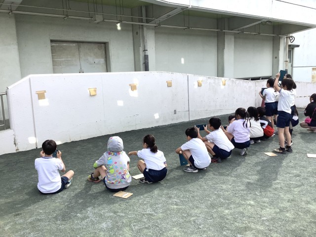 3年生は理科「太陽の光」の学習をしています。鏡で光を反射させ光がどのように進むか、反射させた光を集めた時の様子について調べました。