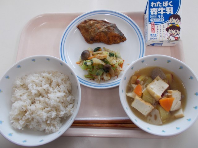 ごはん 魚の竜田揚げ 小松菜としめじのお浸し れんこんと厚揚げのみそ汁 牛乳