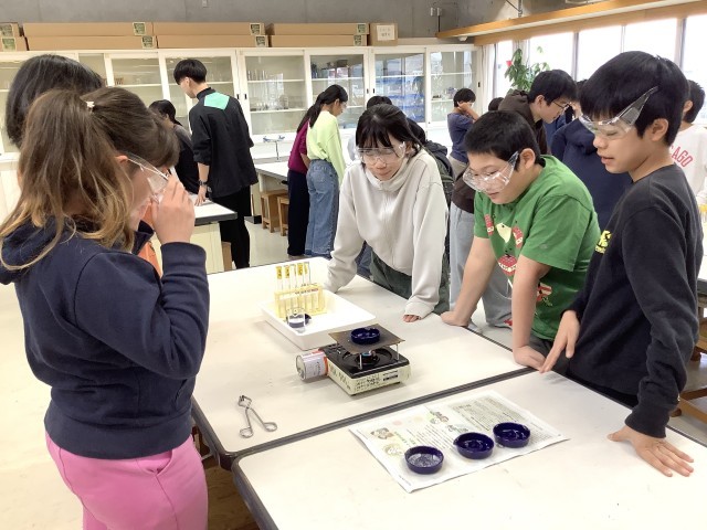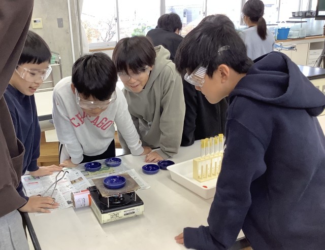 6年生は理科「水よう液の性質」の学習をしています。5種類の水溶液(塩酸、食塩水、アンモニア水、石灰水、炭酸水)を見分けるために問題解決の方法を考え、実験に取り組みました。