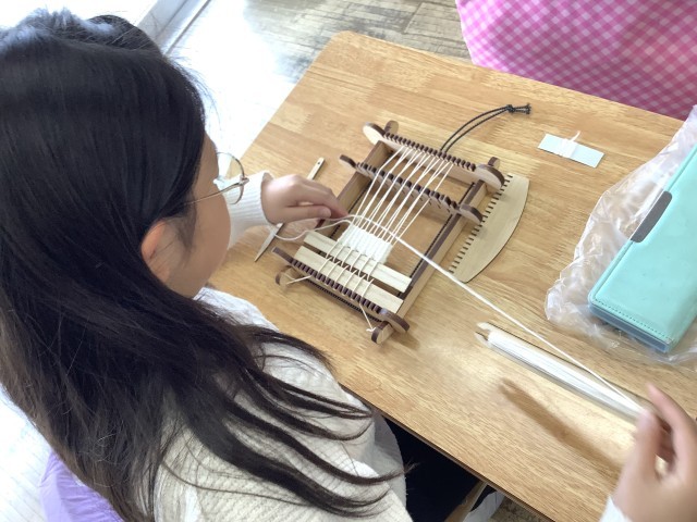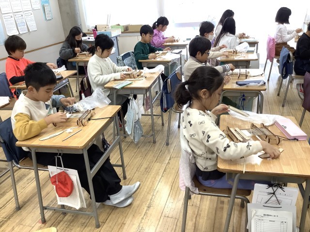 3年生は総合的な学習の時間に「たねからぬのをつくってみよう」の学習に取り組んでいます。今日は3年2組でミニ織り機セットを使って綿コースターを作りました。種から育てた和綿が糸になり、その糸を使って布ができることを体験しました。