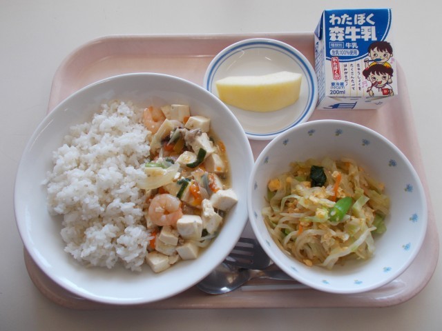 ごはん 海老と豆腐のうま煮 中華風サラダ 果物(りんご) 牛乳