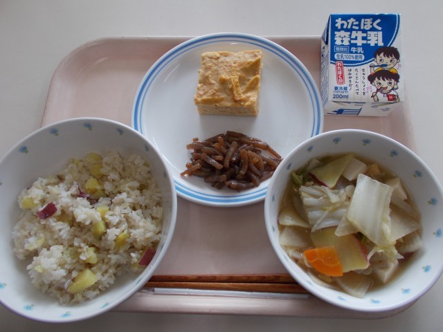 さつま芋ごはん 高野豆腐入り卵焼き ピリ辛こんにゃく 冬野菜の豚汁 牛乳