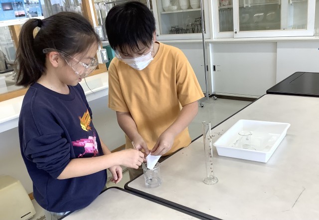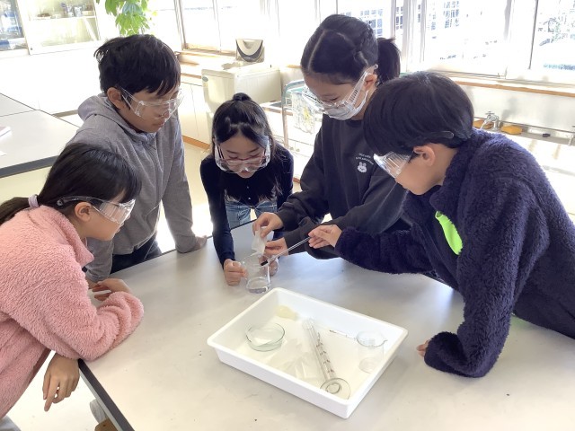 5年生は理科「もののとけ方」について学習しています。今日は食塩が水に溶ける量には限りがあるかを調べました。