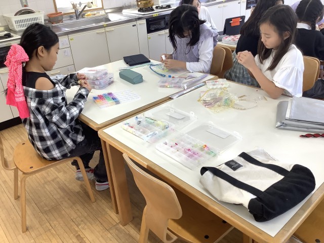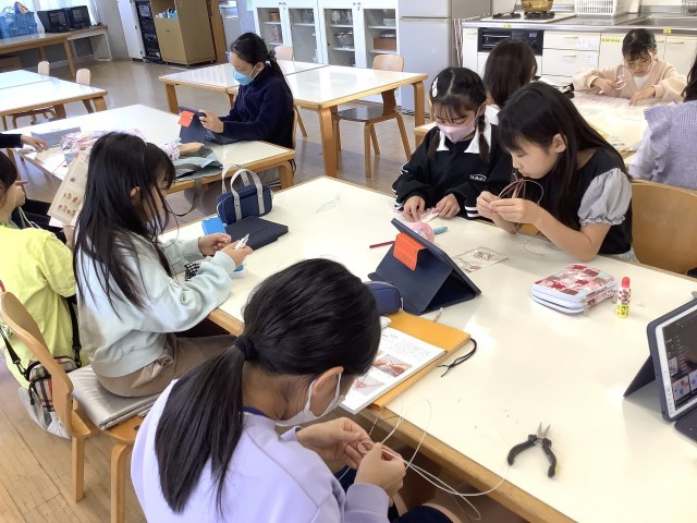 手芸クラブでは、ビーズでお気に入りの小物を作ったり、水引を使ってあわじ結びなどを熱心に作ったりしています。
