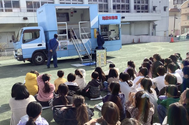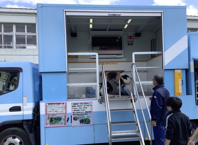 避難訓練終了後に、全校児童の前で6年生の代表児童が「起震車体験」をしました。担任の先生方は震度7の揺れを体験しました。3年生と6年生は4人一組で震度5弱の揺れを体験して、地震が発生した時の行動の仕方を学びました。