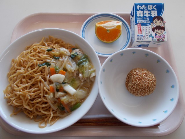 白菜あんかけそば さつま芋のごま団子 果物(早香) 牛乳