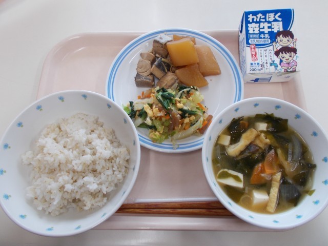 ごはん ぶり大根 千草和え 豆腐とわかめのみそ汁 牛乳