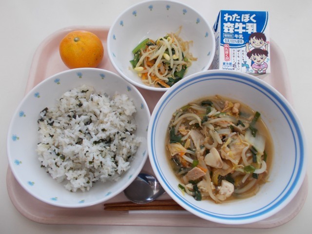 わかめごはん チゲ豆腐 豆もやしのナムル 果物(みかん) 牛乳