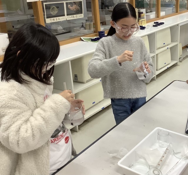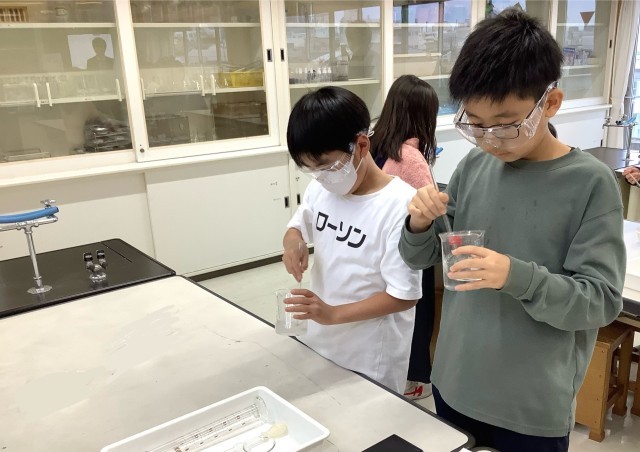 5年生は理科「もののとけ方」の学習をしています。今日は、溶け残った食塩やミョウバンをさらに溶かすにはどのようにすればよいかを実験で確認しました。