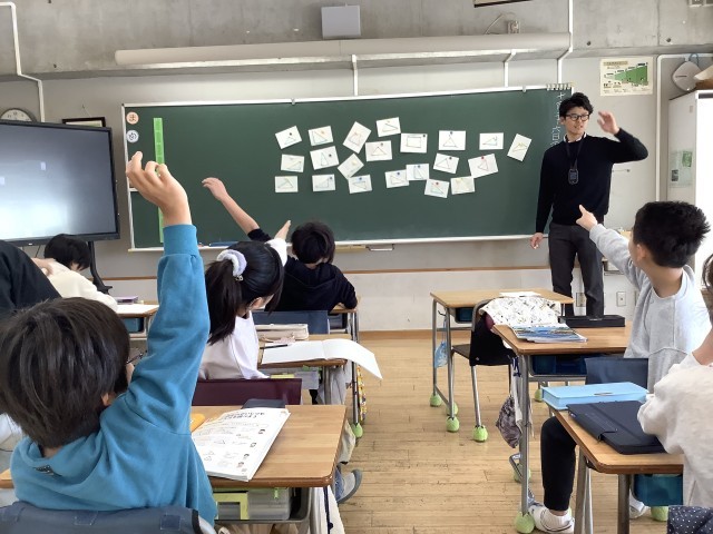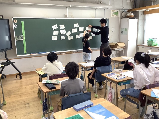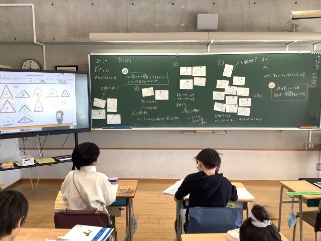 3年生は算数「三角形と角」の学習をしています。前時にストローでつくった三角形を、辺の長さに着目して仲間分けをしました。