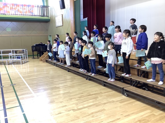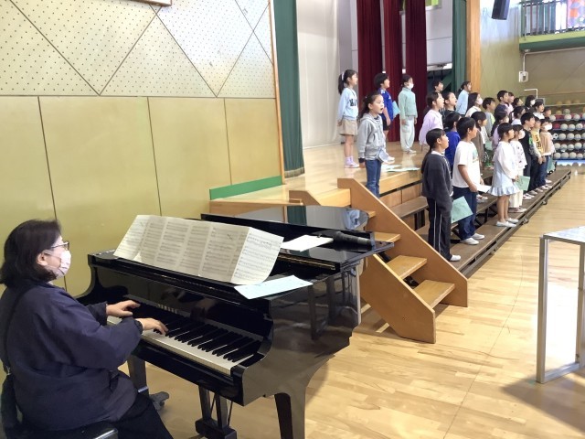 2年生は、学芸発表会で音楽劇「スイミー」に取り組みます。国語で学習した「スイミー」の物語に出てくるいろいろな場面を、楽しく元気よく歌って発表します。
