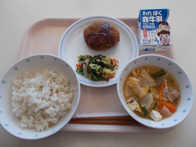 ごはん キノコメンチカツ のり和え キムチ入り豚汁 牛乳