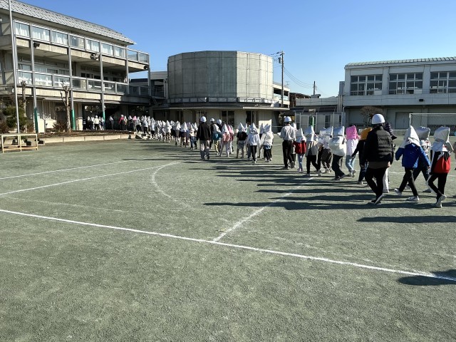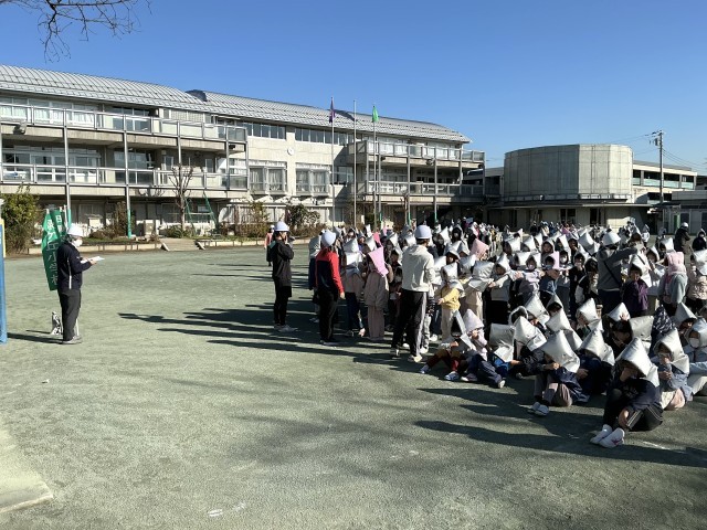 プール横の近隣から火災が発生し、煙がひどく延焼の恐れがあるため第二次避難場所へ避難する想定で避難訓練を行いました。