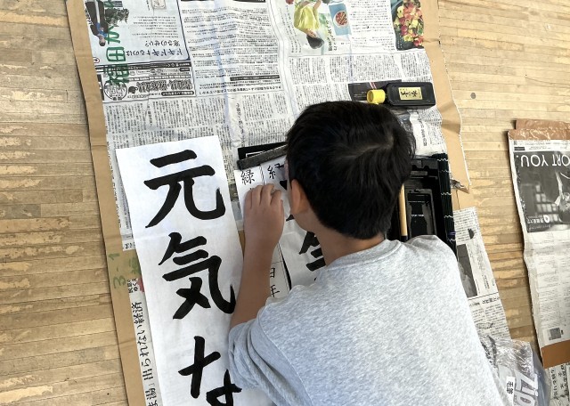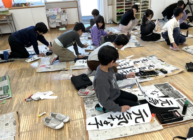 4年生は教室で書き初めの練習をしました。よい字を書くために、心を落ち着けてお手本をよく見るよう先生からお話がありました。