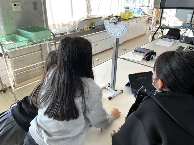 5年生は、理科「ふりこの性質」の学習をしています。ふりこの1往復する時間は何によって変わるのかについて、ふりこの長さ、重さ、振れはばについてグループごとに課題を決めて実験に取り組みました。