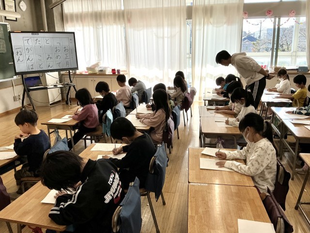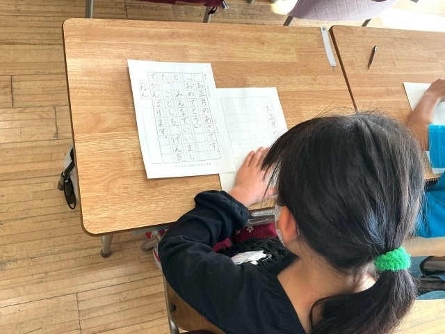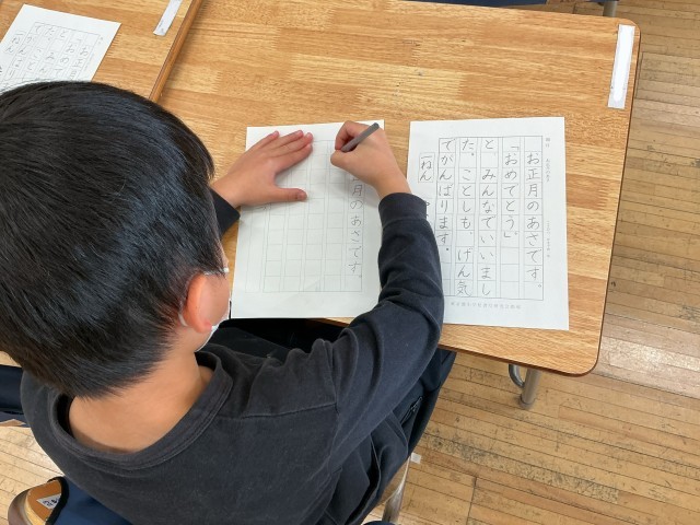 1年生は初めての硬筆書き初めの練習に取り組んでいます。お手本をよく見て、ゆっくりゆっくり丁寧に書いています。