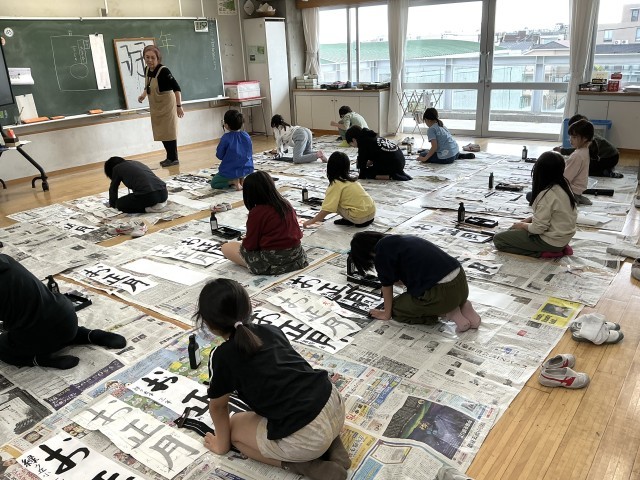 それぞれの学年で、書き初めの練習をしました。3年生は教室で、5年生は体育館で何度も書いて試していました。