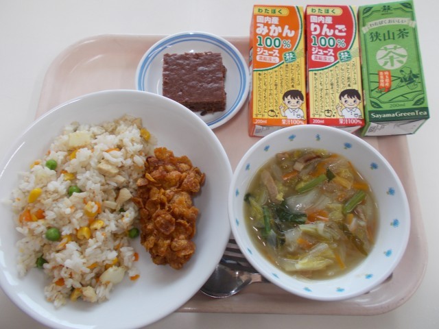コーンピラフ パリパリチキン 野菜スープ ブラウニー セレクト飲み物(みかんジュース・りんごジュース・緑茶)