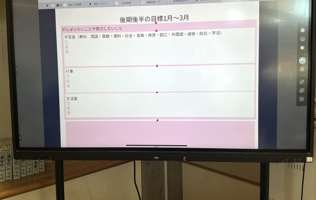4年生は、後期後半の初日に学習や生活、行事等の目標を考えました。目標達成に向けて継続的に取り組むことができるとよいです。