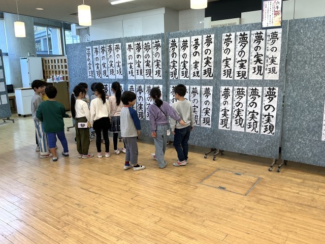 校内書き初め展がランチルームで行われています。1年生は、自分の作品を見たり、友達の作品を見たりしました。6年生の毛筆習字の作品を見て「上手だね」と感心していました。