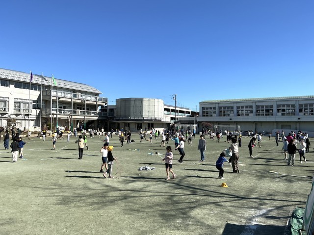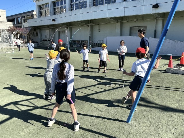 1月の中休みは、全学年短なわに取り組んでいます。縦割り班ごとに集まって、高学年が低学年に教えたり、自分でなわとびカードに取り組んだりしています。