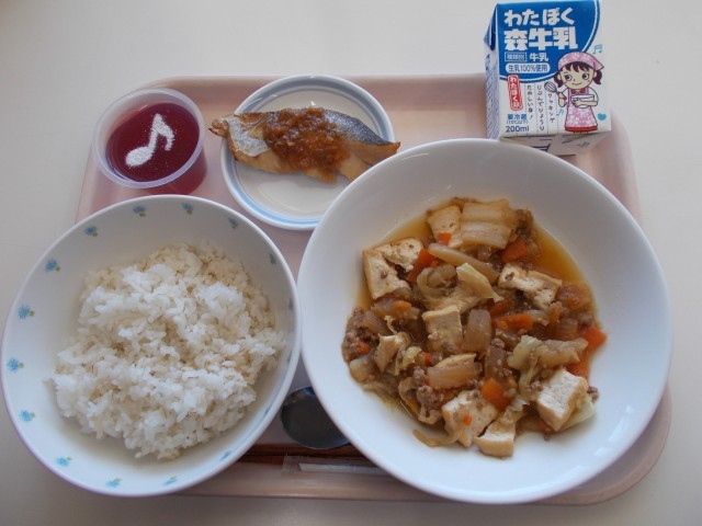 ごはん 魚のにんにくみそだれ 冬野菜と生揚げのごま炒め煮 ぶどうゼリー 牛乳