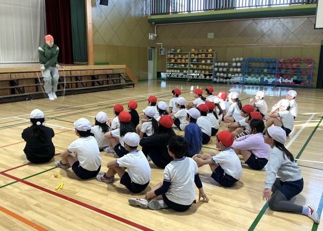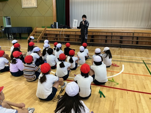 1〜3年生は、「笑顔と学びの体験活動プロジェクト」の取組で、プロなわとびプレーヤーの生山ヒジキさんにお越しいただき、なわとびの基本や跳び方のコツを教えていただきました。本校へは2度目のご来校となりました。
