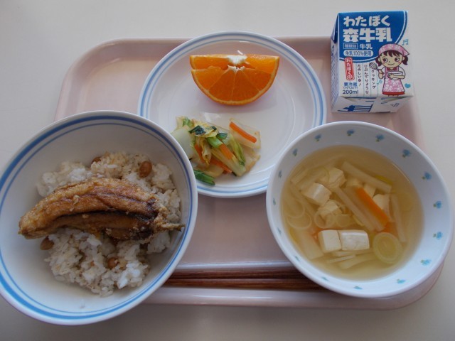 節分丼 辛子和え すまし汁 果物(天草オレンジ) 牛乳