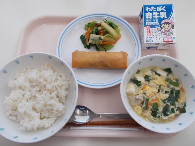 ごはん 春巻き お浸し ニラたまスープ 牛乳