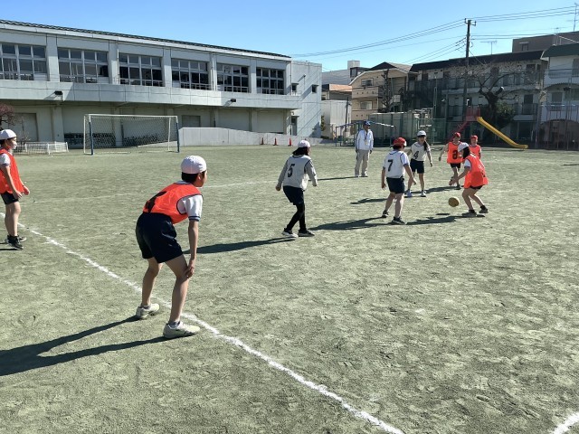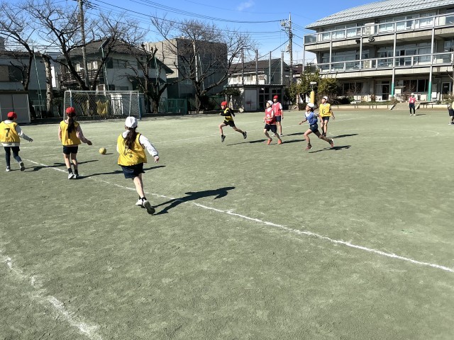 4年生は体育でラインサッカーに取り組んでいます。みんなが活躍して楽しむことができるように、ルールを工夫して試合をしています。校庭に大きな歓声が響いています。
