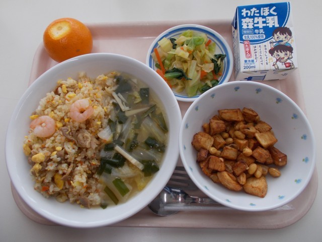 あんかけチャーハン ビーンズポテト 野菜のピリ辛和え 果物(津の輝き) 牛乳