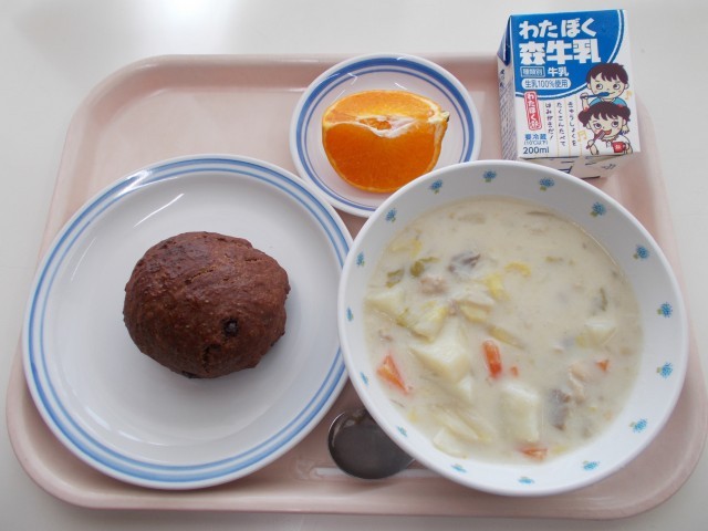 手作りチョコチップパン 白菜入りクリームシチュー 果物(甘平) 牛乳