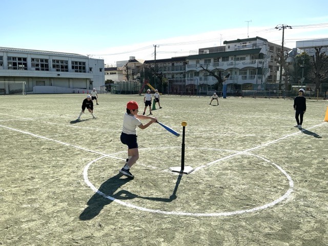 3年生は、体育「Tボール」に取り組んでいます。本塁に置いたバッティングティーの上の止まったボールをバットで打ち、打った後に到達したベースの数で得点が入ります。軟らかいボールを使ってゲームを楽しんでいます。