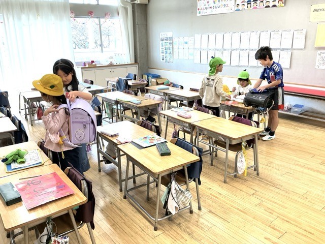 1年生は、近隣の保育園6園の年長さんと1年生体験の交流会を行いました。グループを作って、1年生が年長さんを案内します。年長さんは、教室ではランドセルを背負い、黄色い帽子をかぶって座席に座ったり、ランチルームでは給食の白衣に着替えて、トングで配膳の体験をしたりしました。1年生はお兄さんお姉さんらしく、年長さんをしっかり案内していました。