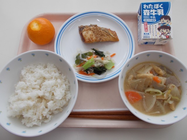 ごはん 魚のごまみそ焼き 大根とじゃこのサラダ 呉汁 果物(津の輝き) 牛乳