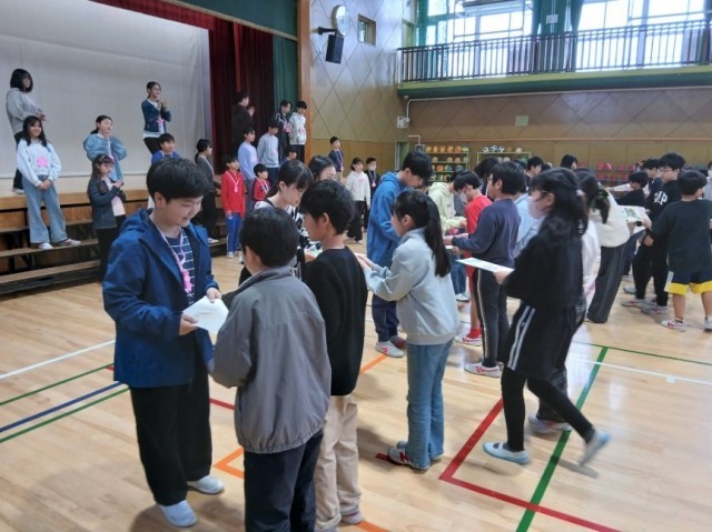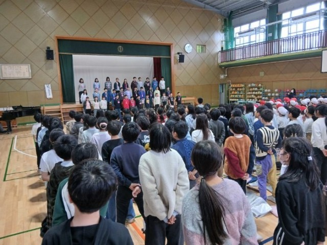 6年生は在校生へのお礼に「アイノカタチ」を歌いました。すてきな歌声に子どもたちも先生方も感動しました。6年生を送る会の後半は、縦割り班ごとに6年生へプレゼントを渡し、全員で「さようなら」の歌を歌いました。心温まるとてもよい6年生を送る会でした。
