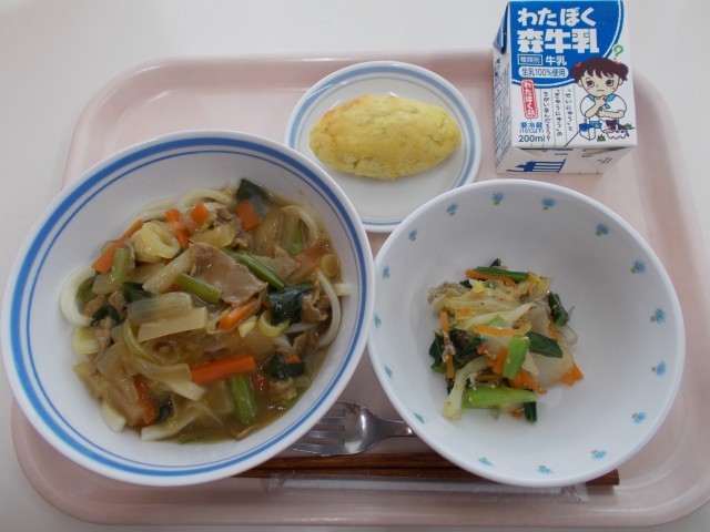 カレーうどん さっぱりごま酢和え スイートポテト 牛乳