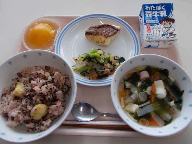赤飯 魚の塩焼き のり和え すまし汁 おかしなお菓子な生卵 牛乳