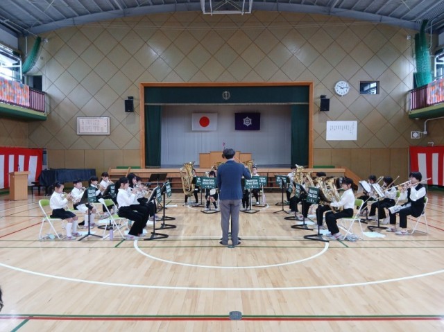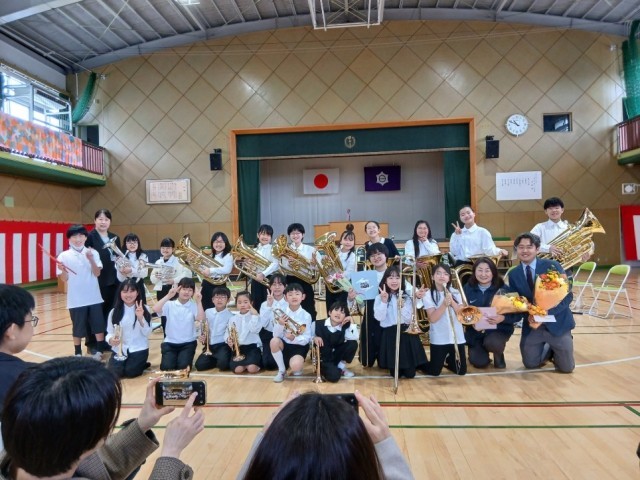 体育館でブラスバンドのスプリングコンサートと卒団式を行いました。一年間の練習の成果を発揮し、全6曲を演奏しました。