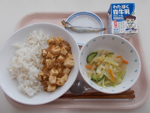 麻婆豆腐ごはん 焼きししゃも 春雨サラダ 牛乳